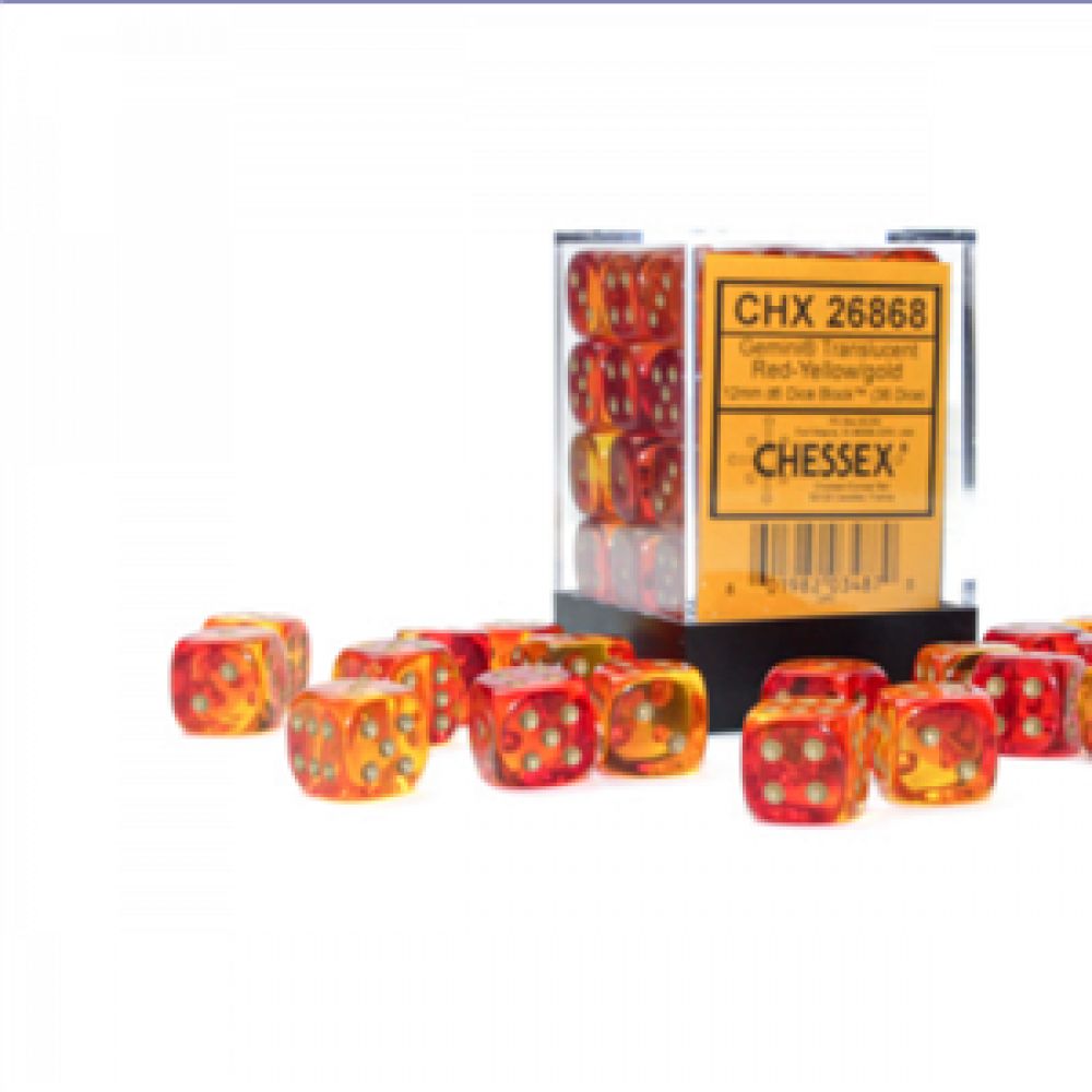 Chessex Gemini 12mm d6 Translucent Red-Yellow/gold Dice Block (36 dice)