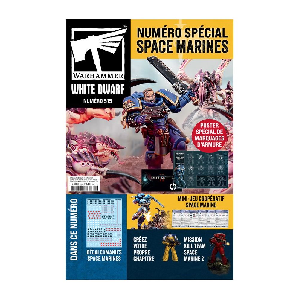 Chaque exemplaire du numéro 515 de White Dwarf s'accompagne d'un encart en carton proposant une carte double face qui présente les scénarios du mois pour Warhammer 40,000 et Warhammer Age of Sigmar, une planche de décalcos des Space Marines proposant 442x décalcos, un poster A2 présentant des modèles d'armures énergétiques sur une face et une illustration de Warhammer 40,000: Mechanicus 2 sur l'autre, et 8x cartes double face pour le mini-jeu Opérations Space Marines.